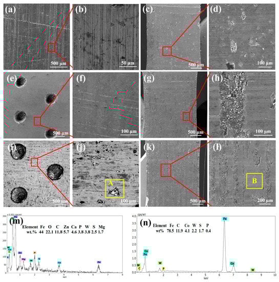 However, for the TCW sample, in addition to the honing patterns on the surface, some residual material was also found in the honing patterns, as shown in the region A in Figure 5j. The EDS results of region A (Figure 5m) indicated that it was WS2. Moreover, there was also a noticeable amount of solid lubricant WS2 remaining inside the dimples. It demonstrates that some of the WS2 released from the dimples is stored in the surface honing patterns. As for the corresponding piston ring, much more coating remained on the surface, as shown in Figure 5k,l. The EDS results of region B (Figure 5n) demonstrated that some WS2 was also transferred to the piston ring surface. Since the solid lubricant WS2 has a layered structure and low intermolecular shear strength, it can form an intermittent solid lubricating film on the friction surface, exhibiting excellent anti-friction performance []. This also explains the small and smooth friction coefficient of the TCW sample in Figure 3a. Furthermore, the EDS results of area A also showed that, in addition to the matrix element Fe, there were a higher content of O and a lower content of Zn, P, Mg and Ca elements on the surface. The oxygen may be derived from iron oxides which are formed during the friction process. The Zn, P, Mg and Ca elements indicate that, in addition to the solid lubricant WS2, polar additives in the lubricating oil also participate in friction reduction under high temperature conditions []. In addition, the EDS elements mapping results of the worn surface of the TCW sample also showed that S and W were homogeneously distributed over the entire worn surface. Moreover, some mapping areas also showed that S and O overlapped, indicating that some sulphure was oxidized during the test, as shown in Figure 6.