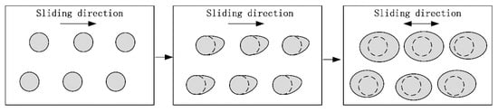 Thus, the transfer mechanism can be induced, as shown in Figure 7. Firstly, under the erosion effect of the lubricating oil, the solid lubricant deposited in the dimples will become loose and expansive. Then, the solid lubricant will be scraped onto the surface of the cylinder by the reciprocating piston ring. Under the extrusion action of the piston ring, part of the solid lubricant was stored in the micro-texture on the surface of the cylinder, or directly formed a solid lubricating film on the surface to achieve a continuous anti-friction effect. Meanwhile, part of solid lubricant will be taken away from the friction surface along with the lubricating oil.