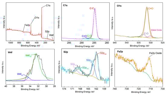 In order to further discuss the anti-friction mechanisms, X-ray Photoelectron Spectroscopy (XPS) was performed on the worn surface. The bonding energies of W4f, S2p, Fe2p, O1s, and C1s were measured to elucidate the chemical bonding on the surface. The results are shown in Figure 8. There are two peaks at 32.5 eV and 34.7 eV in W4f, indicating the existence of WS2 on the surface []. Moreover, the peak of the metal oxides of S2p at 161.6 eV combined with the peak of the oxide of Fe2p at 712.2 eV demonstrate the formation of FeS. The peak in S2p at 168.2 eV proves the presence of SO2 []. In addition, the peak of oxide of Fe2p at 710.8 eV combined with the peak at 530.2 eV belonging to O1s give evidence for the occurrence of Fe3O4 during the friction and wear test []. However, the peaks at 284.8 eV, 286 eV and 288.5 eV of C1s and the peaks at 531.5 eV and 533 eV of O1s indicate the presence of amorphous carbon and its oxides on the surface, which may be the graphite in the cast iron, or foreign pollutants [].