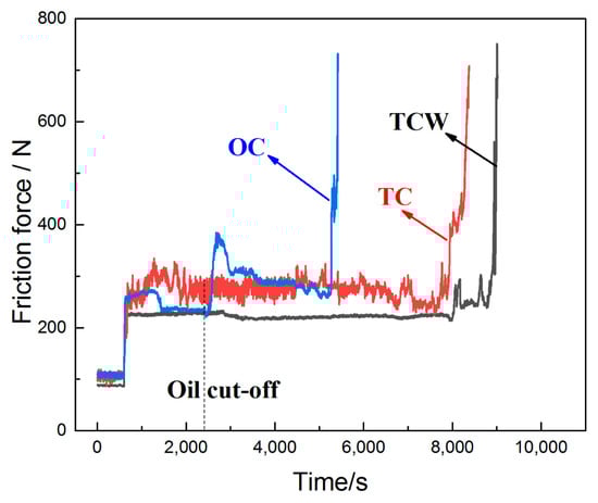 When the oil was cut off, the friction force of the OC sample changed abruptly after about 100 s. Afterwards, it fell back to normal until the adhesive wear occurred. The time from oil cut-off to scuffing was about 2800 s. This phenomenon indicates that the residual oil on the surface can only provide temporary lubrication and the friction state will deteriorate rapidly. The drastic change in the friction force may be related to the polar additives in the lubricating oil which can also be confirmed from the EDS results in Figure 5m. Under high temperature and high load conditions, the polar additives react with the surface to form a chemical reaction film reducing friction force.