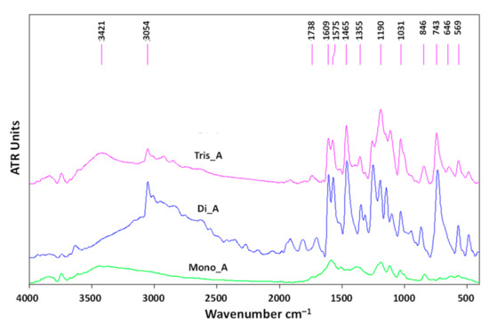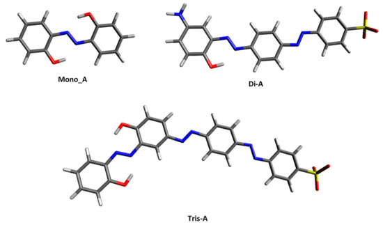 As is expected, all three derivatives exhibit sharp signals at 1607, 1588 and 1609 cm−1, attributed to the −N=N- group. In the FTIR spectra of the new azo-derivatives, the bands at 631 cm−1 (for Di_A) and 646 cm−1 (for Tis_A) correspond to the −SO3Na. All three azo compounds exhibit a specific peak at 1194 cm−1 (Mono_A) and 1190 cm−1 (Di_A and Tris_A) corresponding to the C−O band stretching phenol. The signals located at approximately 3050 cm−1 (at 3052 cm−1 for Di_A and at 3050 cm−1 for Tis_A) are attributed to −OH stretching. The bands at 3440 cm−1 present in the spectrum of Mono_A and 3421 cm−1 for Tris_A correspond to the aromatic −NH2 group.