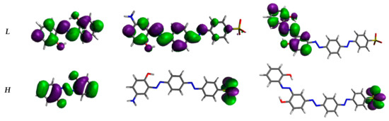 The analysis of molecular frontier orbitals (Figure 3) provides first indications of the hyperpolarizability of compounds. Bis-azo and tris-azo have a slight energy difference between homo (H) and lumo (L) (ΔEH-L) (Table 1), facilitating effective charge transfer: H is only on the sulfonic group, while L is localized on the remaining fragments. Consequently, these azo derivatives show high hyperpolarizability, which increases with ΔEH-L. Similar behaviour has recently been reported in the literature for various azo-derivatives [34].