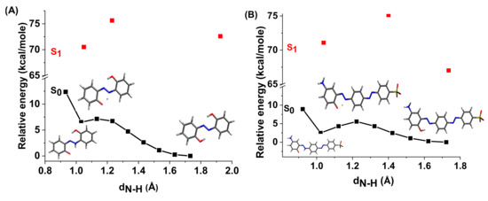 Potential energy profiles for intramolecular proton transfer in DMSO for ground and first excited states of compounds Mono_A (A) and Di_A (B).