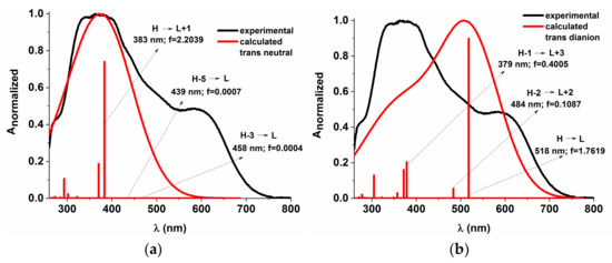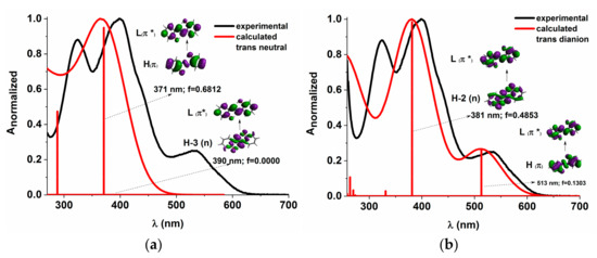 Experimental vs. calculated absorption spectra in DMSO for Mono_A neutral (a) and dianion (b). f represents the oscillator strength. The iso-density value of the molecular orbitals is 0.02 e/Bohr3.