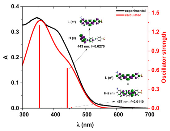 For the compound Di-A, the TD-DFT calculated absorption spectrum based on the neutral azo structure agrees well with the experimental one (Figure 6). The first two excitations, occurring at 457 nm and 443 nm, result from the n→π* and π→π* transitions, respectively.