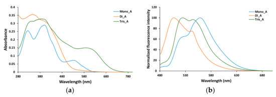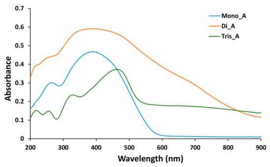 Broad bands in the region 300–400 nm are recorded for bis and tris azo derivatives (compounds Di_A and Tris_A), while the mono azo parent derivative exhibits two distinct peaks at 327 and 402 nm. The compounds Mono_A and Tris_A show also a shoulder located approximately at 550 nm and at 650 nm respectively (Figure 9a).