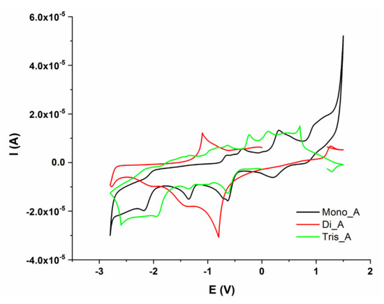 Two working solutions of 10 mL each were prepared and studied: one obtained by dissolving the electroactive compounds Mono_A, Di_A or Tris_A (1 mM) in dimethyl-sulfoxide with 0.1 M Bu4NBF4 as supporting electrolyte. Cyclic and differential pulse voltammetry (CV and DPV) measurements were performed.