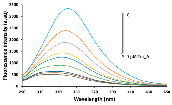 where F0, F and Q have the same significance as that in Equation (2). The double logarithmic plot for Tris_A as representative azo dye derivative is shown in Figure 14b. The plots for Mono_A and Di_A azo compounds are presented in Figures S3 and S4.