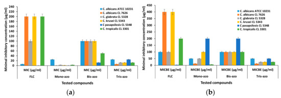 The antifungal activity was quantified using fungi strains both in planktonic growth, expressed as minimum inhibitory concentration (MIC), and against respective biofilms formed, expressed as minimum biofilm eradication concentration (MBEC). The results regarding the MIC and MBEC values of the new di- and tri-azo derivative compared to mono-azo and Fluconazone as reference drug are comparatively represented in Figure 15.