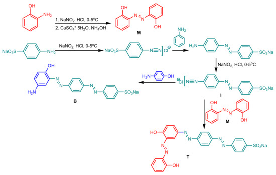 The researchers explored simple approaches for the synthesis of mono-azo dyes, in two stages (i) diazotization of the aromatic (or heteroaromatic) amine under strongly acidic conditions, with the formation of the diazonium salt; and (ii) coupling of the diazonium salt carried out at low temperature in the presence of nucleophilic coupling components [5]. The literature reports, in addition to the classic mono-azo dyes [1], dyes with more complex structures, containing two azo groups [6], dyes that possess three azo groups (tris-azo) [7], four azo groups (tetrakis-azo), or in much rarer cases, molecules where there are more than four azo groups (polyazo).