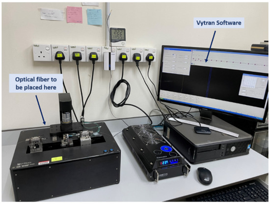 The author used a multimode silica (SiO2) optical fiber purchased from OFS Furukawa. The diameters of the fiber cladding and core are 62.5 μm and 125 μm, respectively. The wide diameter of the multi-mode optical fiber core enables a strong interaction of light with the sensor layer coated in the tapering region. Furthermore, its small size, light weight, and resistance to EMI are also possible for this fabricator’s sensor application used in the visible wavelength range of the near-infrared. Multimode optical fiber provides low attenuation loss and is flexible at high temperatures, making it attractive for a hydrogen sensor in harsh environments. As a result, the properties of silica optical fiber make it an excellent option for high-sensitivity sensors, remote sensing applications, and high-temperature operation [37]. A multimode fiber using a Vytran GPX-3400 glass processing workstation, as shown in Figure 1, were used for the tapered process.