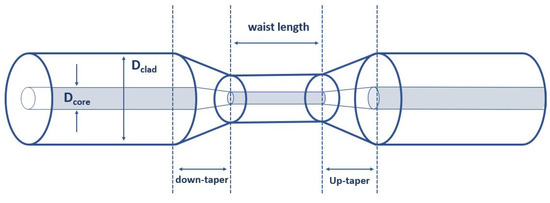 The protective jacket, about 3 cm long, is removed in the tapering step. The tapering procedure is generally performed by pulling and heating the optical fibers. Under a certain pulling force, the optical fiber is stretched and gradually elongated to a desired length and diameter. The shape of the tapered optical fiber can be established by the duration, temperature, and optical fiber tension during the heating step. Argon gas is used in heating to provide an inert local atmosphere. A schematic model of the tapered fiber profile used in this experiment is shown in Figure 2. After the tapering process, the fibers consist of three continuous segments: one tapered waist length segment with a uniform diameter is located in the central region, and is surrounded by two transition regions, called the up-taper and the down-taper regions, whose diameters are gradually changed.