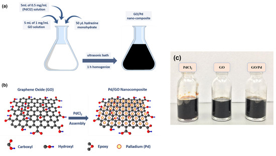 A simple one-step procedure was used to produce Pd/GO nanocomposites. First, a 1 mg/mL palladium chloride (PdCl2) solution and a 1 mg/mL GO solution were mixed, followed by 50 µL of hydrazine monohydrate as a reducing agent [41]. After aggressively stirring the resulting solution for 1 h, a stable 10 mL black suspension was obtained. The solution was placed in an ultrasonic bath for an hour to homogenize. The schematic diagram of the Pd/GO nanocomposite is shown in Figure 4.