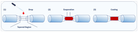 The tapered optical fiber was coated with Pd/GO nanocomposite using a drop-casting technique, in which about 10 µL of the solution was dropped on the fiber base using a tiny pipette and heated to 60 °C in the oven for 20 min to guarantee full evaporation of the aqueous medium [42]. Figure 5 depicts the drop-casting approach used to functionalize a tapered optical fiber with Pd/GO nanocomposites.