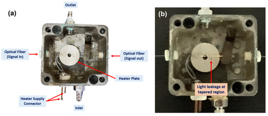Figure 7a shows the modified gas chamber used for H2 sensing. The chamber consists of a heating plate connected to two electrical points connected to the power supply, two ports for gas inlet and outlet, and a thermocouple input. The teflon was drilled on both sides with a hole that meets the optical fiber size. The optical fiber sensor was spliced with a pigtail and connected to the light source and spectrophotometer using an FC-SMA connection. Figure 7b depicts the light that propagates into the optical fiber’s tapered area. According to the image, when exposed to H2, the leaking light interacts with the sensor layer and modifies its characteristics.