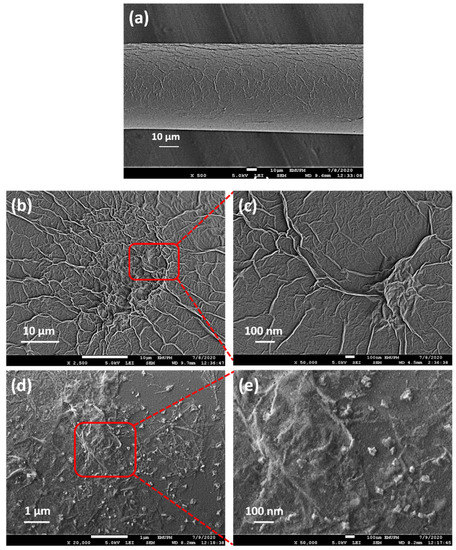 The author performed the FESEM characterisation of the samples to analyse the GO and Pd/GO nanocomposite morphological characteristics. Figure 8a depicts the successful deposition of the GO and Pd/GO nanocomposite on the surface of the tapered fiber. The coated GO surface was relatively smooth, with a wrinkled structure that might be related to the edges of the GO sheets [44]. As demonstrated in Figure 8, wrinkles are significant for GO surfaces because they provide a large area of surface for robust sensing capability (Figure 8b,c). Furthermore, the picture clearly shows that the GO distribution is uniform, as shown in [45,46].