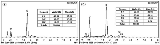 The elemental composition of the GO and Pd/GO nanocomposite were measured by EDX performed in FESEM. The EDX results confirm that the present elements of GO are C, O, and Si, as shown in Figure 9a. At the same time, the EDX result of the Pd/GO nanocomposite was C, O, Pd, and Si in the synthesized nanocomposite, as shown in Figure 9b. The silica fibers used the silicon peak (Si) as a substrate.