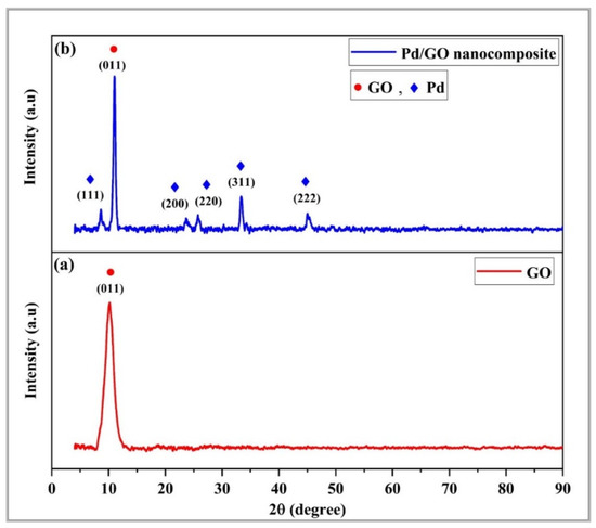 The peaks stated in Figure 10, as well as the strong Pd peaks, are maintained similarly in the GO and Pd/GO nanocomposite samples. This suggests that the Pd nanoparticles were successfully fixated to the Pd/GO matrix. The Pd/GO nanocomposite diffraction pattern revealed a crystal peak value of 2 of 8.63°, 25.75°, 28.55°, 33.40°, 45.01° and matching to the (111), (200), (220), (311) and (222) surfaces of the Pd lens’s central cubic structure, respectively. This is consistent with the known literature [53]. The greatest signal was seen at 2 = 33.40°, indicating that Pd nanoparticles had been incorporated into the GO sheets in the dominant plane (311). As can be observed from the XRD profile of the Pd/GO nanocomposite, the peaks gradually became shorter.