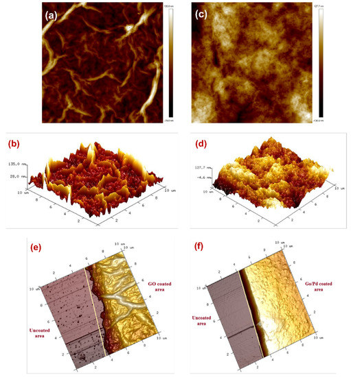 2D topography of AFM images of (a) GO and (c) Pd/GO composite. 3D AFM images of (b) GO and (d) Pd/GO composite. 3D AFM topography images of the boundary region between the uncoated and coated fibers of (e) GO and (f) the Pd/GO composite sensor layer.