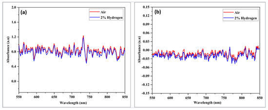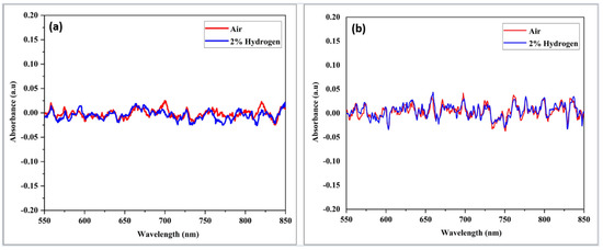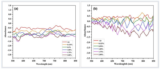 Figure 15a,b illustrates the absorbance spectra of the developed tapered optical fiber sensor toward different H2 concentrations. A distinctive absorbance change can be observed over the wavelength range of 550 nm to 850 nm. This wavelength is selected as the absorbance spectrum demonstrates the largest response toward H2 within this range based on experiments. The absorbance magnitude proportionally increased when H2 concentration increased. Between 550 and 850 nm, absorbance changes were associated with the Pd/GO nanocomposite coated sensors relative to the GO coated sensors. Nevertheless, the absorbance changes were higher in the Pd/GO nanocomposite-based sensors, which may be attributable to the presence of OH in GO [57].