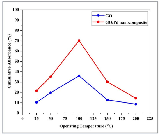 The sensor sample was a Pd/GO nanocomposite coated on tapered optical fiber. Figure 14 depicts the change in cumulative absorbance versus operating temperature of GO and Pd/GO nanocomposites coated on tapered optical fibers when exposed to 2.00% H2 in synthetic air. A spectrophotometer incorporated a response curve from the 550–850 nm wavelength range to calculate cumulative absorbance. The figure depicts the optimum operating temperature of the GO and Pd/GO nanocomposite at 100 °C. The Pd/GO nanocomposite-based sensor exhibits a higher absorbance change than the GO sample. At lower operating temperatures, low absorbance may be due to slow chemical activation between the sensor layer and the absorbed gas molecule [55]. It can also be shown that the adsorption reaction slows down as temperature increases, possibly due to the increased reaction rate of adsorbed hydrogen atoms on active sites at higher temperatures [56]. The optimal operating temperature for GO and Pd/GO H2-based tapered optical fiber sensors for H2 was determined as 100 °C.