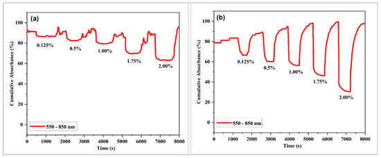 The dynamic absorbance responses of a tapered optical fiber coated with GO and Pd/GO nanocomposite thin film to different concentrations of H2 gas at 100 °C over the wavelength range of 550–850 nm are shown in Figure 16a,b. As shown in Figure 16a, the dynamic response curve demonstrated that the sensor changed in response to the changing H2 concentrations. As a result, the GO-based sensor was not suitable as an active sensing layer for optical gas sensing applications. At a gas level of 0.125% H2, the gas absorption in the GO layer showed a change in absorbance of 5%. At a concentration 2.00% higher, the absorbance increased to 35%. The observed response and recovery time for 2.00% H2 were calculated as 2 min and 11 min, respectively.