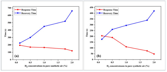 Effect of H2 concentrations on the response and recovery times of (a) GO and (b) Pd/GO nanocomposite-based sensors at 100 °C.