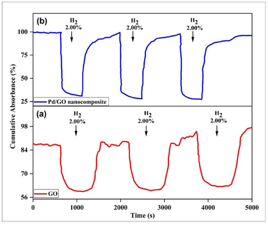 The stability of the GO and Pd/GO nanocomposite-based sensors for 14 days was also measured towards an H2 gas concentration of 2.00% in synthetic air at 100 °C, as shown in Figure 19c. The sensors were stored in a closed container at 20 °C in a dry cabinet to avoid contamination of the sensor surface. After two weeks, the gas response was slightly reduced by 5% and 3% for GO, and Pd/GO nanocomposites-based sensors, respectively. This result indicates that the prepared gas sensors, especially the Pd/GO nanocomposite-based sensor, present excellent stability. The test highlights that contribute greatly to the understanding of the properties of the chemical adsorbent towards H2 are illustrated in Table 1.