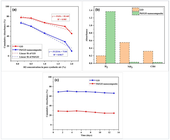 A selectivity test was also performed for sensors coated with GO and Pd/GO nanocomposites towards ammonia (NH3) and methane (CH4). The selectivity measurement and comparison of H2, NH3, and CH4 at the same operating temperature of 100 °C at a concentration of 2.00% were shown in Figure 19b. The sensors were evaluated for selectivity in terms of absorbance response for a specific gas under similar conditions. The H2 absorbance of the Pd/GO nanocomposite sensor was astonishingly high, but its response to NH3 and CH4 gases was noticeably weak. Contrarily, the GO sensor responds to NH3 and CH4 with a greater H2 absorbance response. A high working temperature is required to increase the sensitivity of Pd/GO sensor-based H2 gas because methane is a stable gas that requires significant energy to completely separate H2 from C [59]. The Pd/GO sensor showed less sensitivity to NH3 because Pb is better suited for H2 gas separation [60]. This confirms that the produced Pd/GO nanocomposite-based sensor demonstrates good H2 selectivity compared to the GO-based sensor.