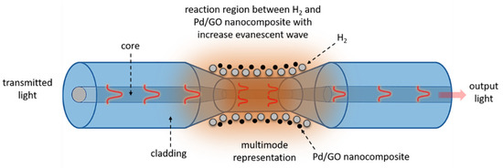 The sensing mechanism of the Pd/GO nanocomposite-based sensor can be explained in Figure 20. The Pd/GO nanocomposite-based H2 sensor mechanism is well-known [41,65,66]. When Pd adsorbs the H2 gas molecules, it changes to Pd hydride (PdHx) (where the Pd particle magnitude expands in small proportion), as it has fewer functions than pure Pd. The PdHx feature is handy in transferring more electronics from Pd to GO. In the Pd/GO nanocomposite, it is hypothesized that graphene oxide played a significant role as a support in carrying and detaching Pd nanoparticles on the tapered optical fiber, hence providing channels for the transport of charges. H2 molecules during Pd nanoparticles adsorption and H2 molecules desorption can diffuse even if Pd nanoparticles are coiled and loaded by graphene oxide due to the atomic thickness of graphene oxide.