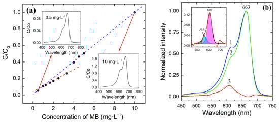 Concentration dependence of the normalized absorbance of MB aqueous solutions in a concentration range of 0.5 to 10 mg·L−1 (from 1.56 × 10−6 to 3.13 × 10−5 mol·L−1) at 25 °C (a). The insets in (a) show absorbance spectra at the lowest and highest measured concentrations. Normalized absorbance of MB solution (b): 10 mg·L−1 (curve 1) and 0.5 mg·L−1 (curve 2). Curve 3 represents the difference spectrum obtained by subtracting curve 2 from curve 1. Inset in (b) shows the deconvolution of difference spectrum 3.