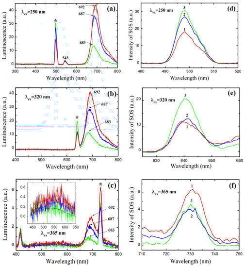 Luminescence spectra (a–c) of MB aqueous solutions with MB concentrations of 1 mg·L−1 (green line), 3.33 mg·L−1 (blue line), and 5 mg·L−1 (red line) under excitation wavelengths of 250 (a), 320 (b), and 365 (c) nm. Asterisks mark second-order scattering. Panels (d–f) show enlarged peaks of second-order scattering; numbers 1, 2, and 3 correspond to MB concentrations of 5, 3.33, and 1 mg·L−1.
