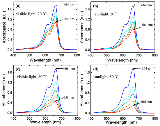 Absorption spectra of MB aqueous solution with a concentration of 10 mg·L−1 under visible light and sunlight illumination at temperatures of 20 and 80 °C for 120 min. Lighting time from upper blue curve to lower red curve: 0, 30, 60, 90, and 120 min. (a) illumination by visible light at 20 °C; (b) illumination by sunlight at 20 °C; (c) illumination by visible light at 80 °C; (d) illumination by sunlight at 80 °C.