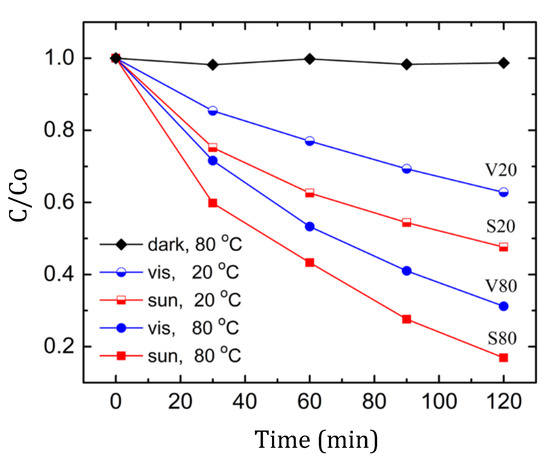 Temporal changes in the normalized absorbance of MB solution (10 mg·L−1) in the dark at 80 °C (black symbols) and under illumination with visible (V) light and sunlight (S) at 20 and 80 °C.