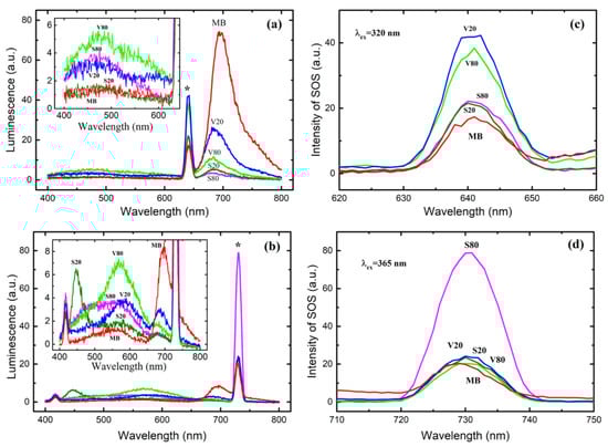Luminescence spectra upon excitation at wavelengths of 320 nm (a) and 365 nm (b) of MB aqueous solutions (10 mg·L−1) after illumination with visible (V) light and sunlight (S) at 20 °C and 80 °C for 120 min. Asterisks mark second-order scattering. The insets show magnified parts of the spectra. The enlarged second-order scattering peaks are (c) and (d).