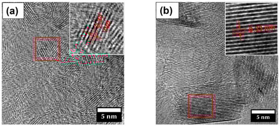 TEM images of the BNO1 (a) and BNO2 (b) samples. Insets show enlarged areas marked with red rectangles (red lines and arrows mark atomic planes).