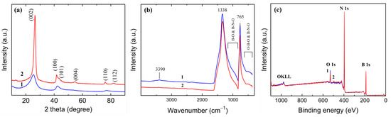 The sample phase composition was determined with a SmartLab diffractometer (Rigaku, Tokyo, Japan) using Cu-Kα radiation and a graphite monochromator. X-ray diffraction (XRD) patterns were recorded in symmetrical mode and analyzed using the PDXL software, (Version 2.8.4.0) (Rigaku, Tokyo, Japan). Fourier-transform infrared (FTIR) spectra were recorded based on powder samples using a Vertex 70v vacuum spectrometer (Bruker, Billerica, MA, USA) in the range of 400–4000 cm−1 with a partial internal reflection device. The chemical composition was analyzed with an X-ray photoelectron spectroscopy (XPS, 18725 Lake Drive East, Chanhassen, MN, USA) using a Versa Probe III (PHI) instrument equipped with a monochromatic Al Kα X-ray source (hν = 1486.6 eV). Atomic concentrations were determined from survey spectra using the relative sensitivity factors of the elements. The integral intensities of the XPS B1s, N1s, O1s, and C1s peaks were used for analysis. The specific surface area was determined with the Brunauer–Emmett–Teller (BET) nitrogen adsorption method using a NOVA 1200e instrument (Quantachrome Instruments, Boynton Beach, FL, USA).
