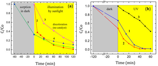 To study the effect of MB sorption on MB degradation, two measurements were carried out: with sorption in the dark for an hour followed by sunlight illumination (curve 1 in Figure 8a) and with sunlight without sorption in the dark (curve 2 in Figure 8a). For comparison, the discoloration curve of the MB solution without a catalyst is also shown (curve 3 in Figure 8a).