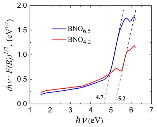 Pure BN is an indirect semiconductor with a bandgap of about 6 eV, which is much higher than the photon energy of visible light. Doping with oxygen reduces the band gap, and with a high oxygen content, it can be only 2.1 eV [52]. To estimate the band gaps of the BNO1 and BNO2 nanopowders, diffuse reflectance spectra (DRS) were collected. Figure 9 shows a Tauc plot,