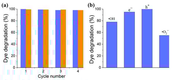 To assess the stability and reusability of the BNOx nanocatalysts, four successive cycles of degradation of MB solutions under UV illumination were carried out. The obtained results are shown in Figure 10a. After four cycles, the degradation ability of the catalysts remained at the 98% level, which indicates their high stability.