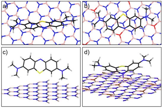 Methylene blue (MB) is a widely used phenothiazinium dye that finds applications as a photosensitizer, as well as a redox and optical redox indicator in analytical chemistry and in trace analyses of anionic surfactants [1]. MB is also used for anticancer treatments in photodynamic therapy [2,3,4,5,6]. The widespread industrial use of dyes leads to their inevitable release into the environment. According to available estimates, about 10–15% of more than 0.7 million tons of dyes produced annually worldwide are released into the environment [7]. At the same time, MB is known to be a toxic and carcinogenic pollutant, which requires precise control over its concentration, as well as efficient removal or degradation to less toxic substances. Adsorption and photodegradation are effective ways to purify water from toxic pollutants. Various materials, such as activated carbon and coal [8,9], as well as natural and renewable biomaterials [10,11,12], are used as adsorbents for MB removal. Various adsorbents for organic and inorganic substances have been tested [13,14,15]. Recently, it was shown that hexagonal boron nitride (h-BN) is also a good adsorbent for organics [16,17,18].