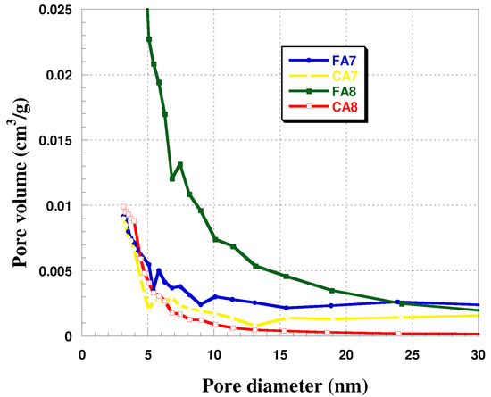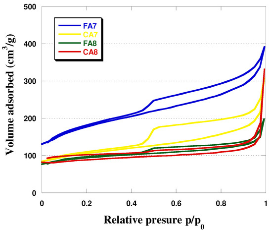 Analysis of the effects of the type of starting material and activation temperature shows that with increasing temperature of activation, the specific surface area of the biocarbons increased. Moreover, greater SBET was obtained for the biocarbons obtained from fennel fruit. The activation temperature was also observed to have impact on the mean pore size in the biocarbons studied (Figure 1, Table 2). For samples FA7 and CA7, the average pore sizes were 6.37 and 7.65 nm, respectively, while for samples FA8 and CA8 (activated at 800 °C), the analogous values were 4.19 nm and 3.68 nm. As for the contribution of micropores in the sample structures, it was the greatest—63%—for CA8. The character of the structure of the biocarbons studied was corroborated by isotherms, presented in Figure 2. For FA7 and CA7, a distinct hysteresis loop of H4 type was observed, whose presence indicates a greater contribution of mesopores in the porous structures of these biocarbons. The isotherms recorded for FA8 and CA8 also show hysteresis loops, but much smaller ones, which implies that their pores were a.