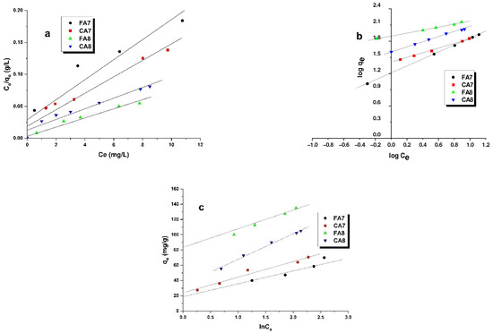 where: qm is the monolayer capacity [mg/g]; KL is the Langmuir constant [L/mg]; KF is the Freundlich constant [mg/g × (mg/L)1/n]; nF is a constant that characterizes the surface heterogeneity; B is a constant equal to B = RT/BT, where BT is the Temkin constant [J/mol], R is the universal gas constant [J/mol × K], T is the absolute temperature [K], and AT is the Temkin isotherm equilibrium binding constant [L/mg].