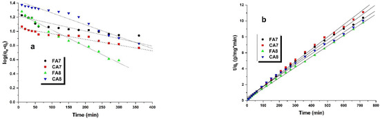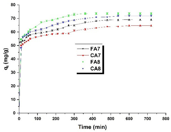 Methyl red sodium salt adsorption from water solution was very fast at the beginning of the process. In the first phase of the process, the surfaces of all samples studied, FA7,CA7, FA8 and CA8, had a significant number of active centers easily accessible to the dye [40], which led to a rapid augment in sorption capacity. As the process time increased, the active centers on the sample surface were occupied and a state of adsorption equilibrium is reached. As seen in the shape of the isotherms, the adsorption equilibrium was achieved for all samples in about 500 min. After this time, no further increase in sorption capacities was observed. The time needed to reach the adsorption equilibrium by the samples studied was close to 8 h, which is rather long taking into account the results presented in [15,41].