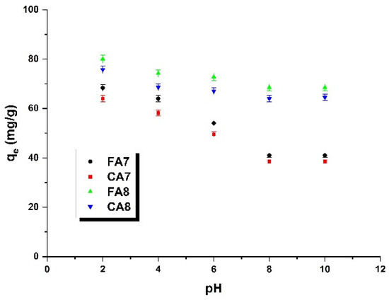 Figure 8 illustrates the impact of the pH of the dye solution (a) and adsorption temperature (b) on the efficiency of removal of methyl red sodium salt from the aqueous solution by the biocarbons obtained from fennel and caraway fruits as precursors, activated by carbon(IV) oxide. The effect of the pH of the dye solution was analyzed in the pH range of 2 to 12. According to the data presented in Figure 8, as the sorption capacity of all samples decreased, the pH of the dye solution increased, so the supreme sorption capacities were noted at a pH of 2. Then, the sorption capacities gradually decreased with pH increasing up to a pH of 8. At a pH of 10, no changes were noted. For samples FA7 and CA7, the effectiveness of the dye adsorption decreased much faster than for FA8 and CA8. The gradual decrease in sorption capacity with increasing pH of the methyl red sodium salt solution may be a consequence of the electrostatic interaction occurring between the anion dye and the adsorbent surface, as the acidic groups present in the biocarbon samples may interact with the dye molecules [43].