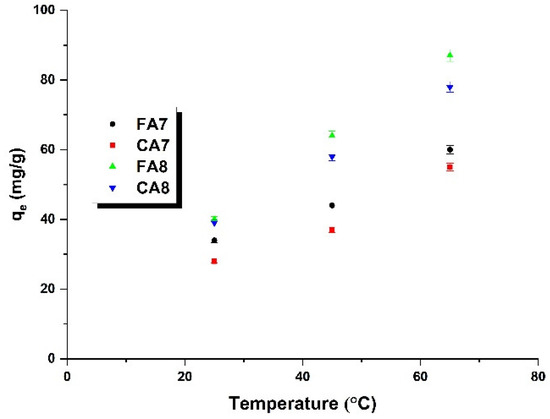 The effect of adsorption temperature on the sorption capacities of the biocarbon adsorbents was tested in the range of 25 to 65 °C, and the results are presented in Figure 9 and Table 6. As displayed in Figure 9, the greatest sorption capacities were measured for the process taking place at 65 °C. Moreover, as the adsorption temperature increased, the sorption capacities of all samples increased, which suggests that the process of adsorption has an endothermic character [44]. Analysis of the data presented in Figure 9 indicates that temperature of adsorption has no significant effect on the dye removal efficiency. For sample FA7, the increase in sorption capacity reaches about 25 mg, while for the other bioadsorbents the capacity was about 40 mg.
