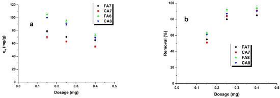 Figure 10a presents the effects of the amounts of adsorbents (or portion size of the adsorbent) on their sorption capacities towards methyl red sodium salt in water solutions. The adsorbent doses varied from 0.3 to 0.8 g/L. Analysis of the results shows that the use of an increasing amount of adsorbents (or an increasing size of the adsorbent portions) leads to decreasing sorption capacities. This is a consequence of a decreased amount of the dye per unit mass of the adsorber, which leads to a diminished coefficient describing the use of active sites. The effectiveness of the dye removal from its water solution (Figure 10b) increased with increasing size of the adsorbent portions, so with increasing surface area and number of active sites [47]. For the adsorbent portions of 0.025 and 0.040 g, no significant changes were noted.