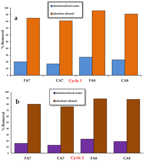 The possibility of the reuse of biocarbon in adsorption is of great importance [37]; therefore, at the next stage of the study, desorption of methyl red sodium salt from the biocarbon’s surface was performed. Portions of 0.050 g of each adsorbent were flooded with 50 mL of a dye solution with a concentration of 40 mg/L. The samples were shaken for 12 h on a shaker (Heidolph, Schwabach, Germany) at a rate of 200 rpm/min. After drying, the biocarbons were flooded with 10 mL of two eluents: demineralized water and absolute ethanol. The methyl red sodium salt was washed out for 6 h and the amount of the desorbed dye was determined by the spectrophotometric method at 443 nm. The changes in the sorption capacity of the biocarbons after one (Figure 11a) and two (Figure 11b) cycles of regeneration showed that the desorption was more effective when using absolute ethanol.