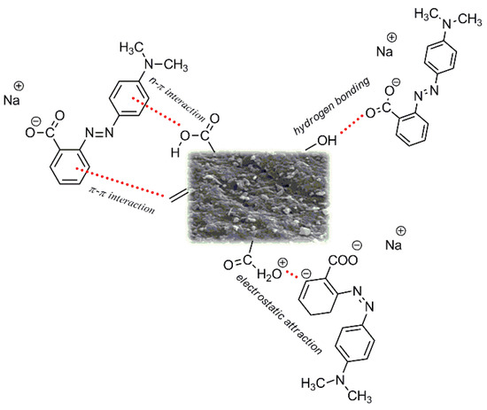 Much greater effectiveness in removal of methyl red was seen with the activated carbon obtained from custard apple (Annona squamosa) fruit shell [35]; its sorption capacity was over 100 mg/g greater than the capacity of biocarbon FA8. The adsorbent based on Annona squamosa fruit shell [35] was obtained by chemical activation using phosphoric acid at a weight ratio of the precursor to activator 1:1.5. After activation, the adsorbent was washed with a 1% solution of sodium bicarbonate and doubly distilled hot water, which increased the production cost of these bioadsorbents. The carbon sample obtained from the Annona squamosa fruit shell showed the specific surface area of 1064.95 m2/g, which is much greater than that of sample FA8’s 371 m2/g. Moreover, the much better developed porous structure of the carbon adsorbent obtained by chemical activation also contributed to its high sorption capacity. It may be expected that the increase in the activation temperature and/or time of activation for the biocarbon based on fennel fruit would result in obtaining samples of greater specific surface area and, thus, higher sorption capacity. That is why in subsequent studies attention will be paid to the proper choice of these parameters in the process of biocarbon synthesis. Figure 12 presents the possible interactions that may take place between the methyl red molecules and the surface of biocarbons. The sorption capacities obtained in this study may be related to electrostatic interactions and the formation of hydrogen bonds. The mechanism of adsorption of methyl redsodium salt may also involve the π-π and n-π interactions. It should be highlighted that the adsorption of methyl red sodium salt may be affected not only by the structure of the dye, but also the by the properties of the surface of carbon adsorbents.