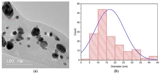 TEM image (a) and size distribution (b) of the dispersed components in the hydroalcoholic extract of D. filix-mas containing phytosynthesized silver nanoparticles.